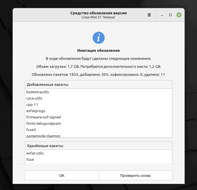 - Далее будет проведена имитация процесса обновления, которая проведет еще ряд тестов и сообщит о пакетах которых будут удалены и установлены.