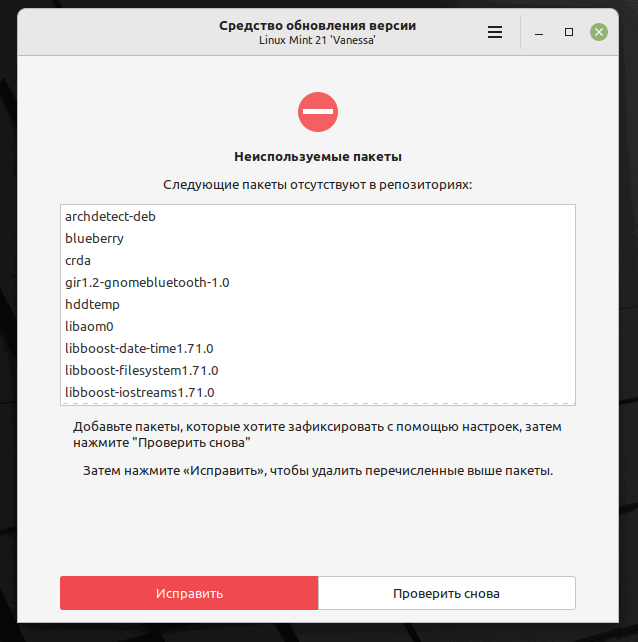 - Неиспользуемые пакеты, это те пакеты, в которых нет необходимости в новой версии системы. Если вам необходимы данные пакеты, то не закрывая инструмент обновления, перейдите в меню Настройки > Неиспользуемые пакеты, добавьте нужные вам пакеты, они будут сохранены в процессе обновления.