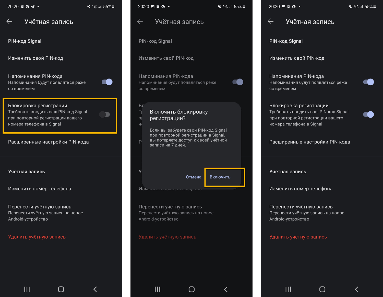 Signal призывает пользователей включать блокировку регистрации в своих учетных записях Signal для защиты своих аккаунтов. Вы можете сделать это в меню Signal Настройки > Учетная запись > Блокировка регистрации. Это добавит дополнительный уровень безопасности — приложение попросит вас ввести PIN-код Signal, чтобы снова зарегистрировать учетную запись.
