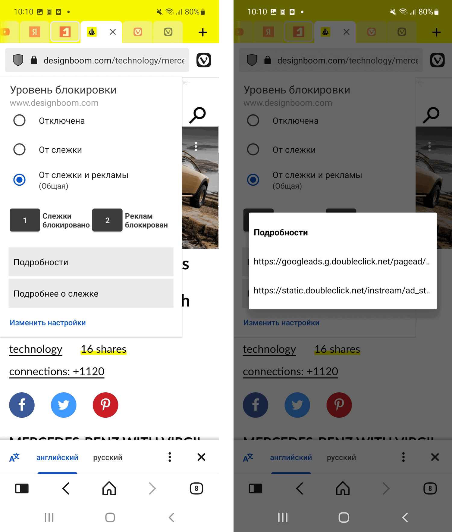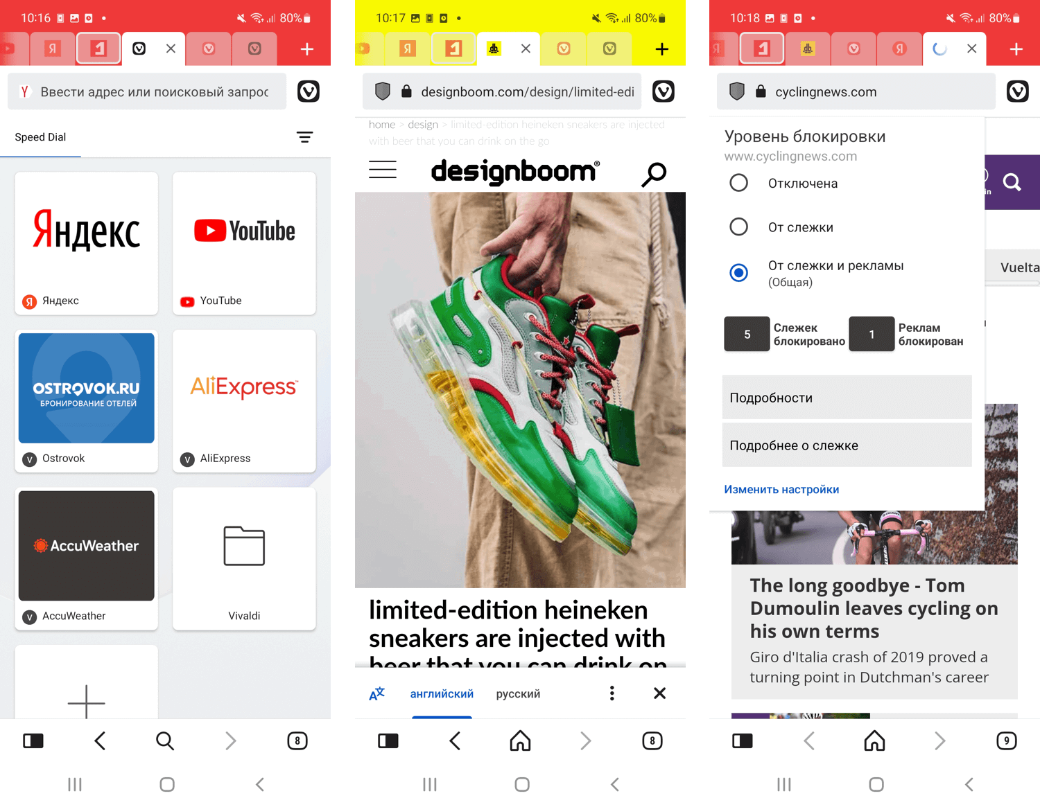 В версии 5.4 появились счетчики, которые показывают количество заблокированных Vivaldi рекламных объявлений и трекеров. Вы можете использовать диалоговое окно, чтобы быстро переключить блокировку для определенного сайта и проверить информацию о трекере и рекламе.
