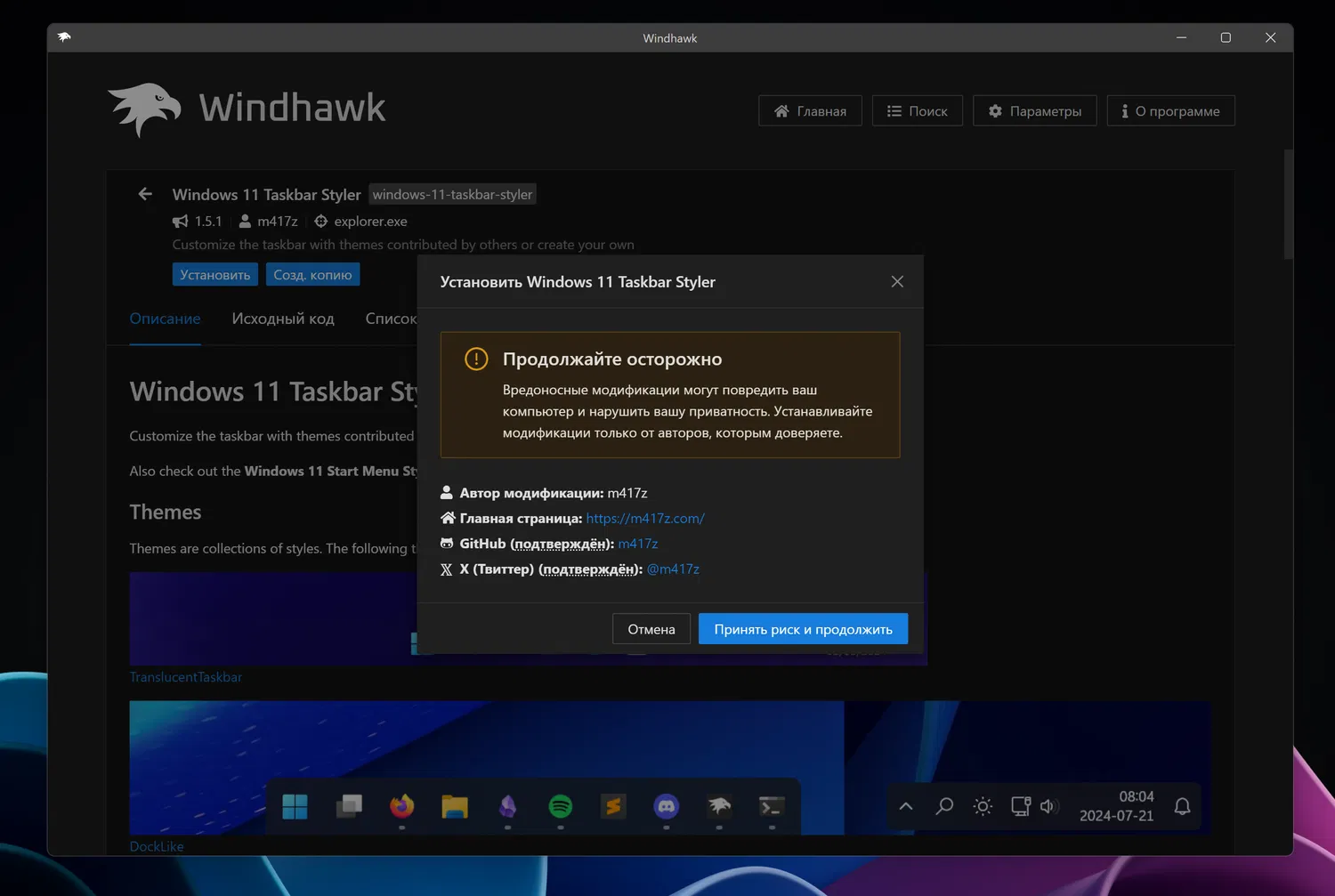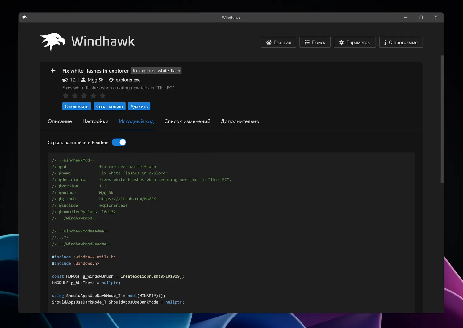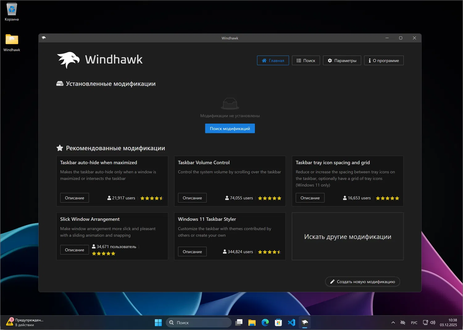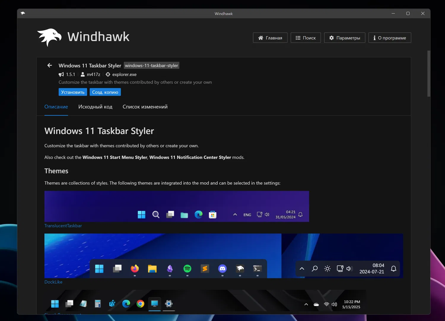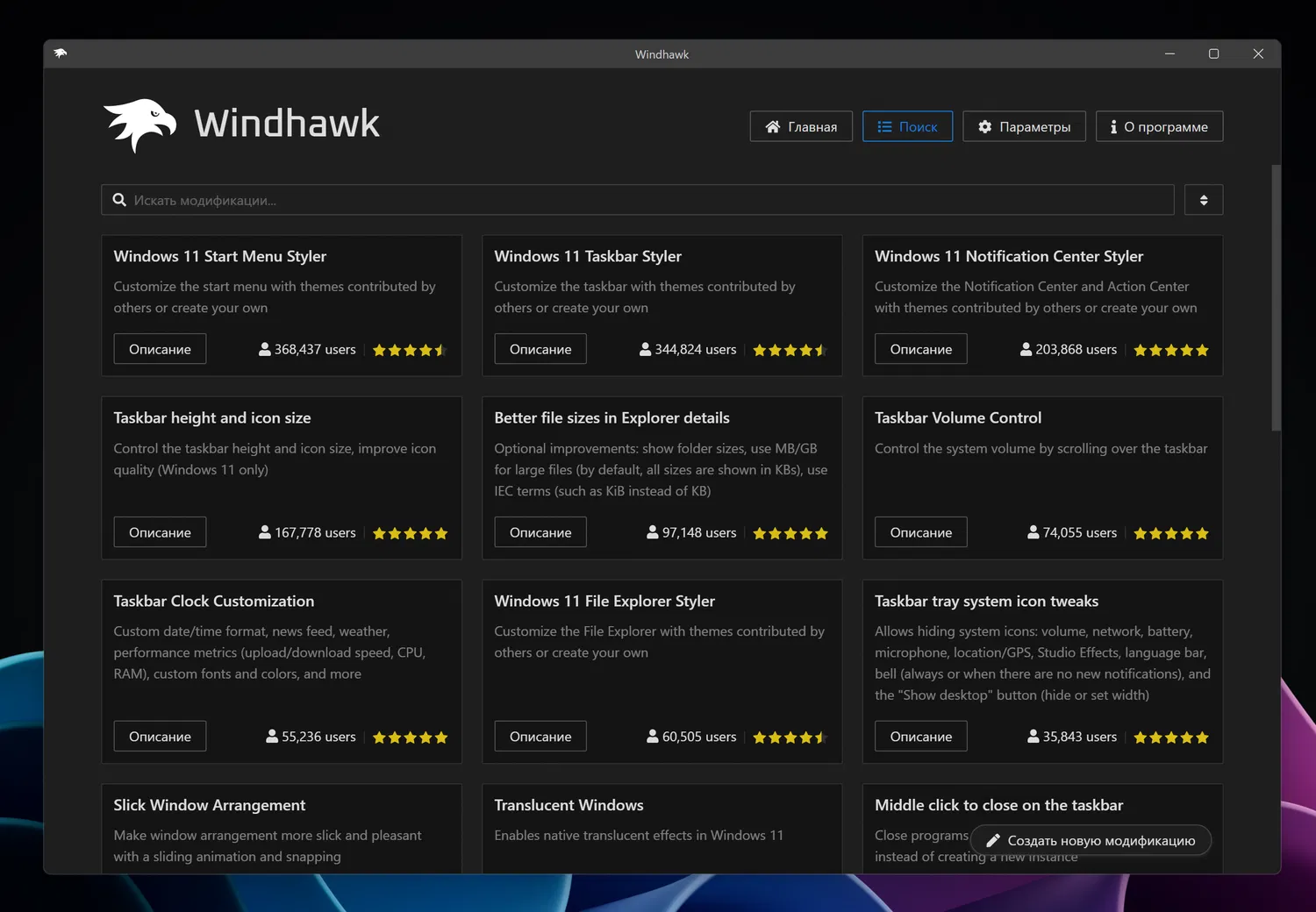 Одной из главных идей Windhawk является его модульная конструкция. Разработчики могут создавать моды — модификации, которые пользователи Windhawk могут загружать и применять в своих системах.
