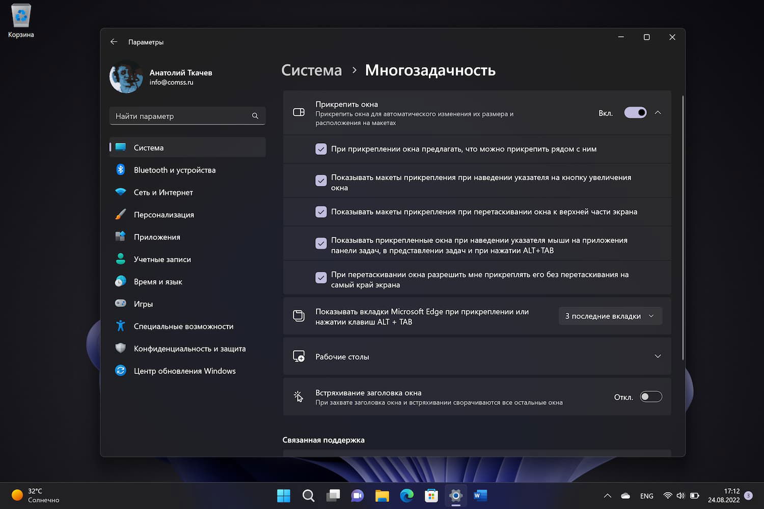 - Перейдите в меню Пуск > Параметры > Система > Многозадачность