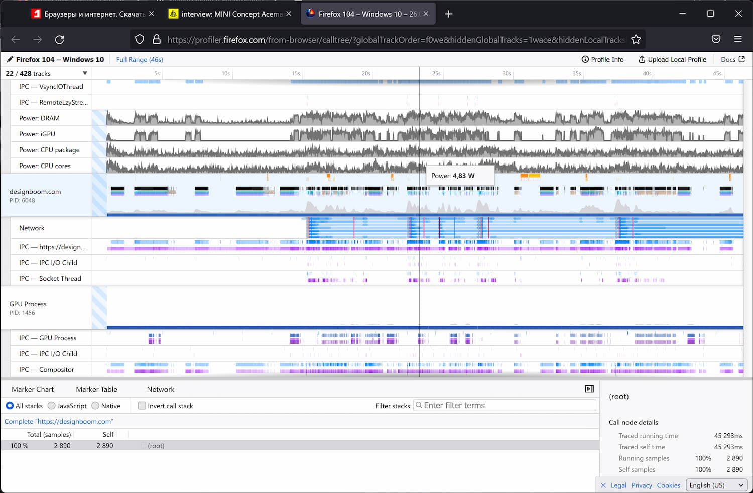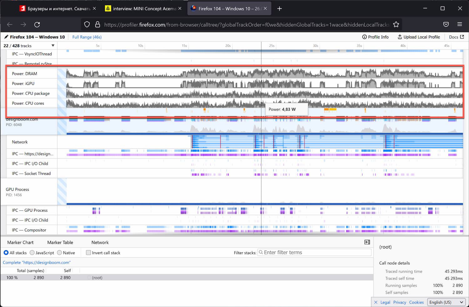 Firefox перечисляет, какая мощность процессора, сколько ядер и iGPU требуется веб-сайту во время использования. Наведите указатель мыши на эти данные, чтобы получить фактические показания, например, 4,83 Вт на отметке 24 секунд.