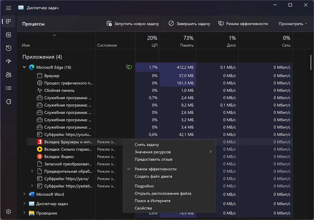Контекстное меню остается прежним, за исключением недавно добавленного «Режима эффективности» — пользователи могут завершать задачи, создавать файл дампа, открывать расположение файла, запускать поиск в Интернете, изменять значения ресурсов и открывать свойства.