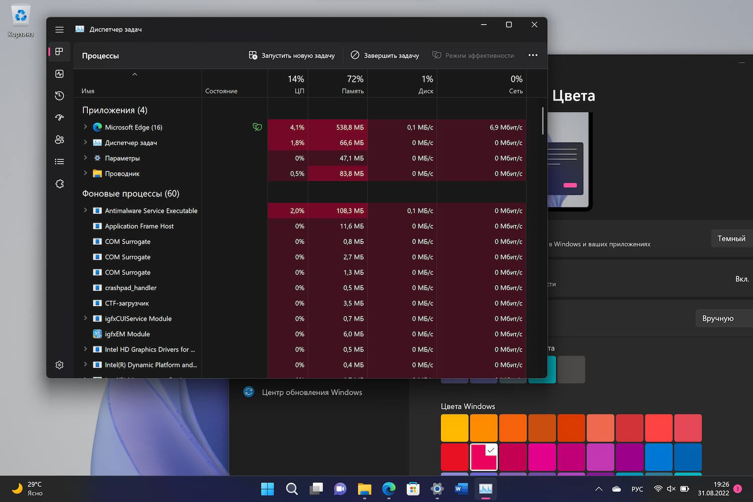 В Windows 11 2022 Update Диспетчер задач получил поддержку акцентных цветов. Акцентные цвета настраиваются в приложении Параметры > Персонализация > Цвета. Можно установить один из предложенных цветов или указать цвет вручную.