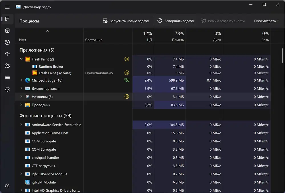 Еще одно изменение, связанное с повышением производительности и энергоэффективности, — выделение приостановленных процессов UWP. Диспетчер задач помечает их значком паузы.