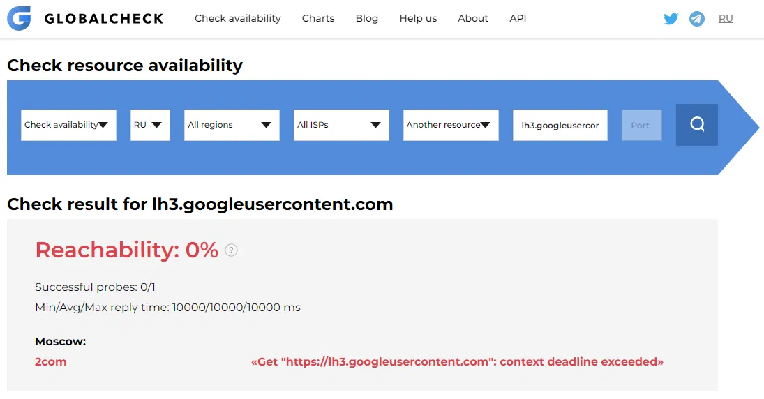 Сервис GlobalCheck показывает 0% доступности к части сайтов и URL-адресов Google.