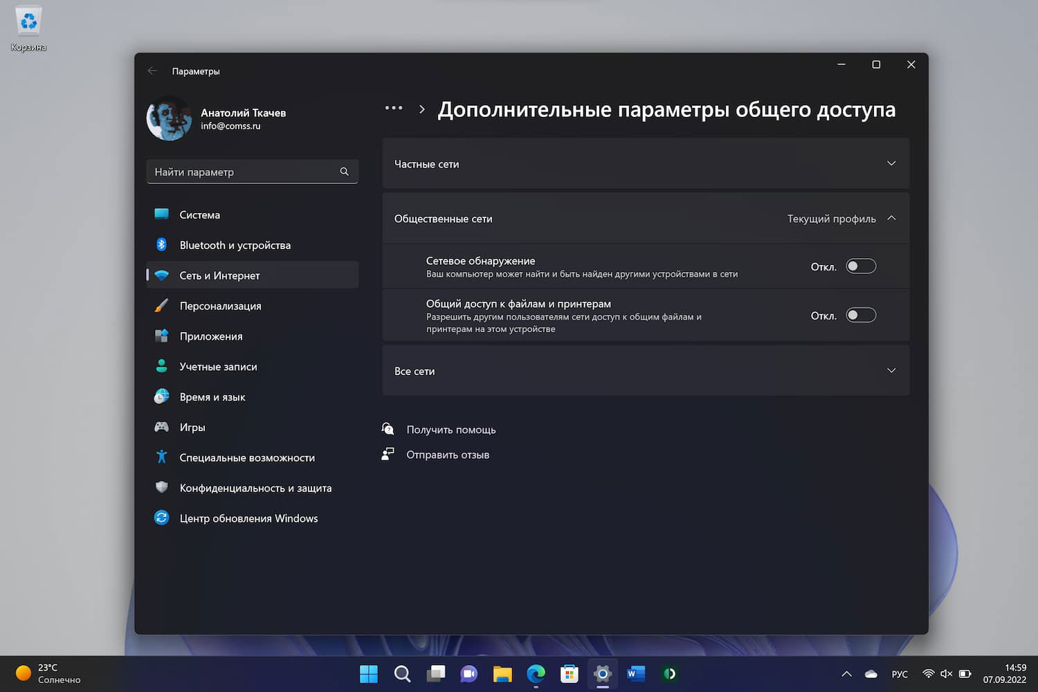 - Общественные сети: Общий доступ к файлам и принтерам — отключено по умолчанию.