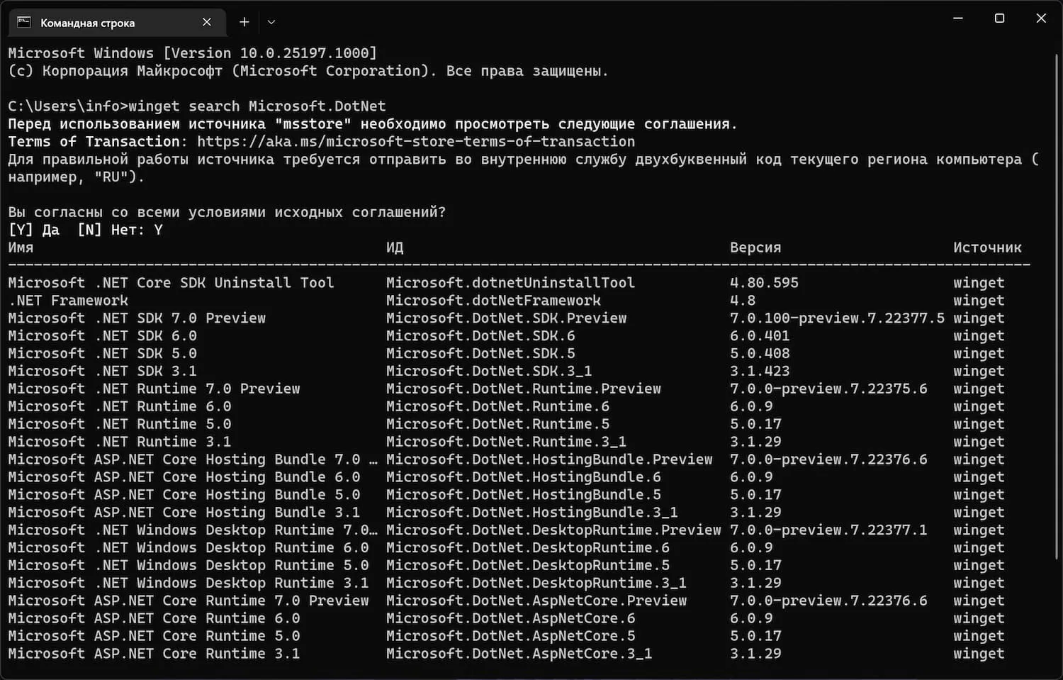 Откройте окно командной строки и выполните следующую команду, чтобы проверить доступные пакеты .NET: