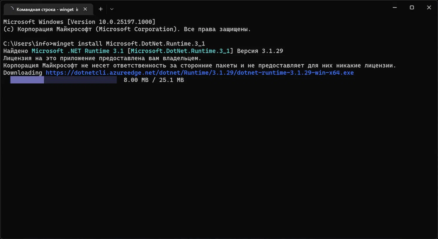 Идентификатор пакета (package-id) — одно из значений при запуске поиска доступных компонентов Microsoft.DotNet. Например, чтобы установить Microsoft .NET Runtime 3.1 на устройство, вы должны выполнить следующую команду.