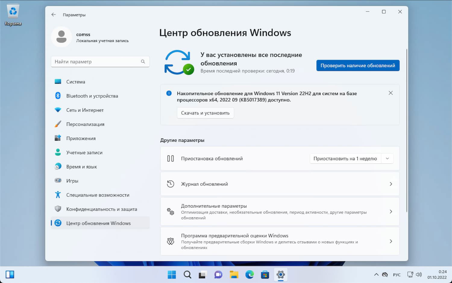 Когда вы увидите, что доступно Накопительное обновление для Windows 11 Version 22H2 для систем на базе процессоров x64, 2022 09 (KB5017389) нажмите Скачать и установить.
