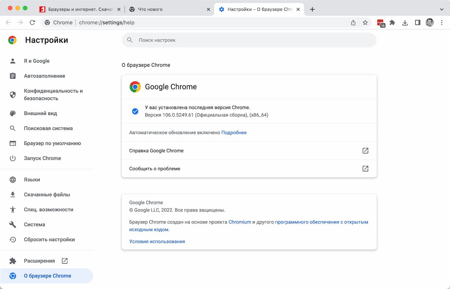 Чтобы проверить версию Google Chrome, перейдите в меню > Справка > О браузере Google Chrome или откройте страницу chrome://settings/help. Если обновление будет доступно, то браузер автоматически скачает и установит свежую версию. Для завершения установки обновления потребуется перезапуск браузера.