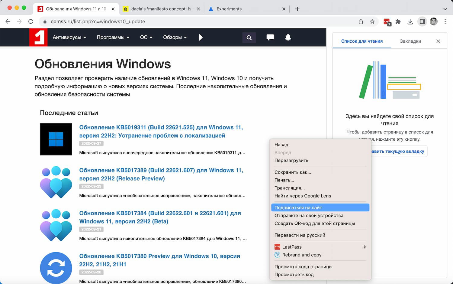 В 2021 году Chrome для Android и iOS получил инструмент для чтения RSS-лент в виде кнопок Подписаться на веб-сайтах. Наконец, эта функция начинает появляться и в десктопной версии Chrome 106. RSS-ридер включается с помощью флага chrome://flags/#following-feed-sidepanel.