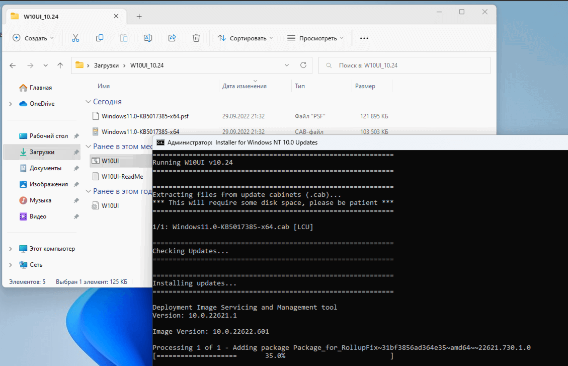 - Скачайте два файла обновления KB5017385 (.CAB и .PSF) для выбранной платформы (x64 или ARM64) и поместите в папку W10UI_10.24.