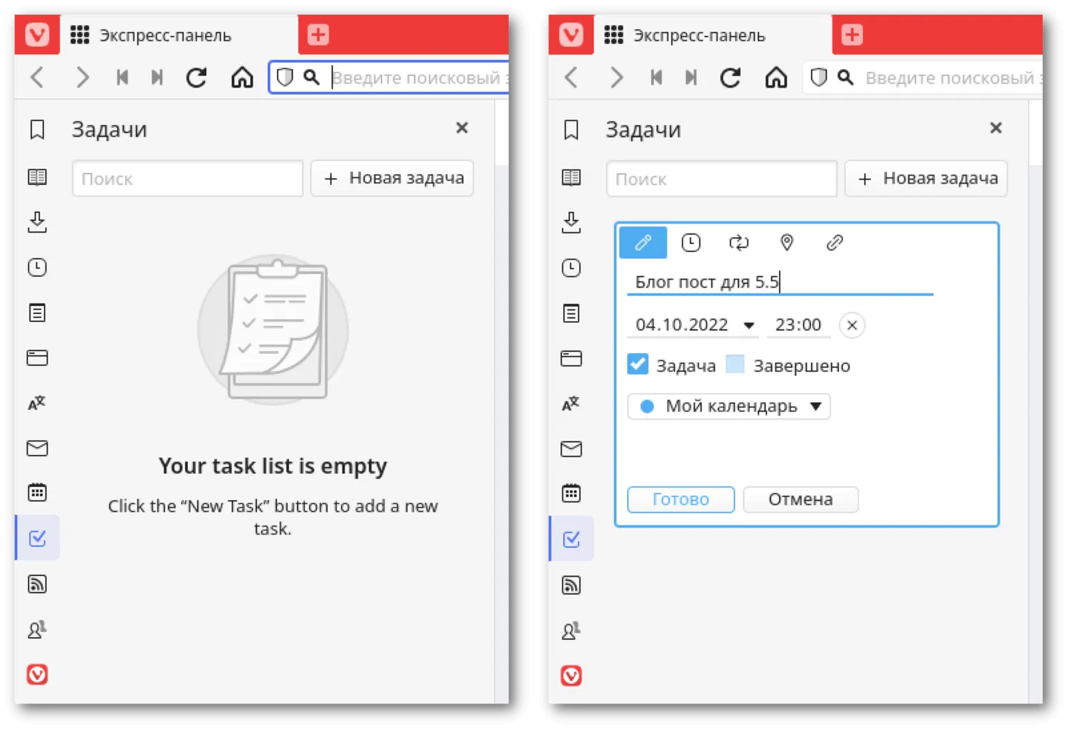 Пользователи Vivaldi могут включить панель «Задачи» в любое время в настройках Vivaldi в разделе Календарь > Включить почту, календарь и ленты новостей.