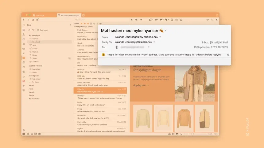 Функция предупреждения о потенциально поддельных письмах также была улучшена в новой версии браузера. Vivaldi отображает предупреждение, когда отправитель и получатель на ответное сообщение не идентичны.