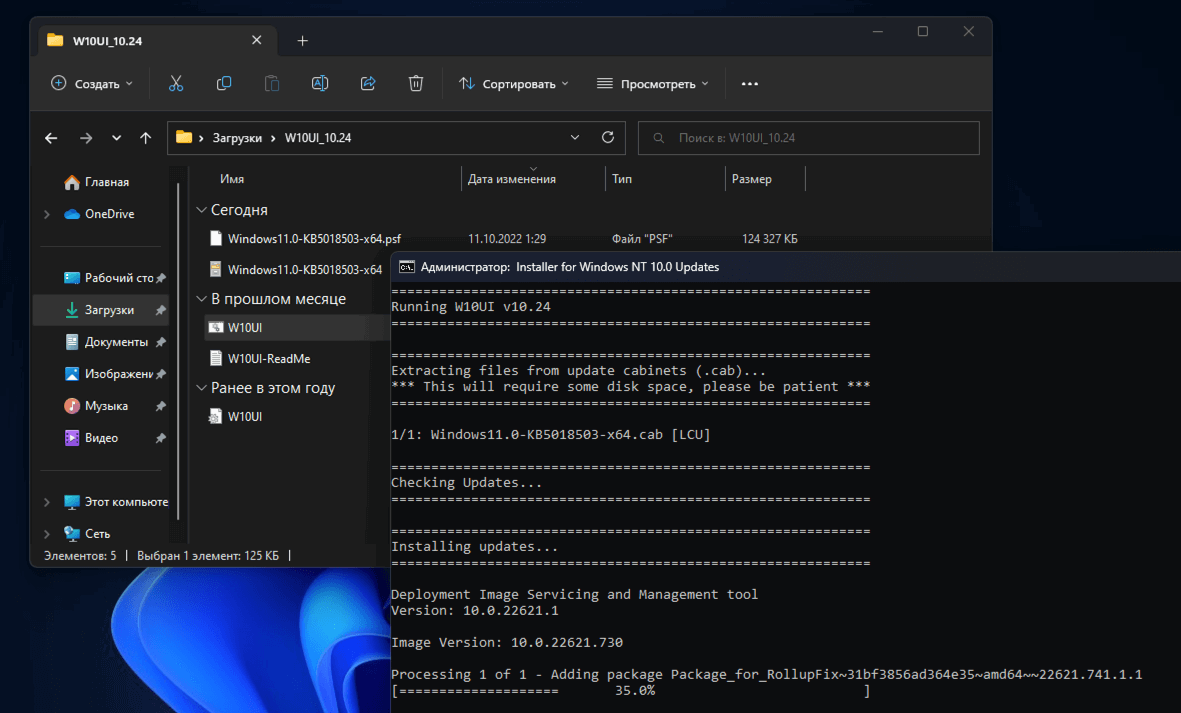 - Скачайте два файла обновления KB5018503 (.CAB и .PSF) для выбранной платформы (x64 или ARM64) и поместите в папку W10UI_10.24.