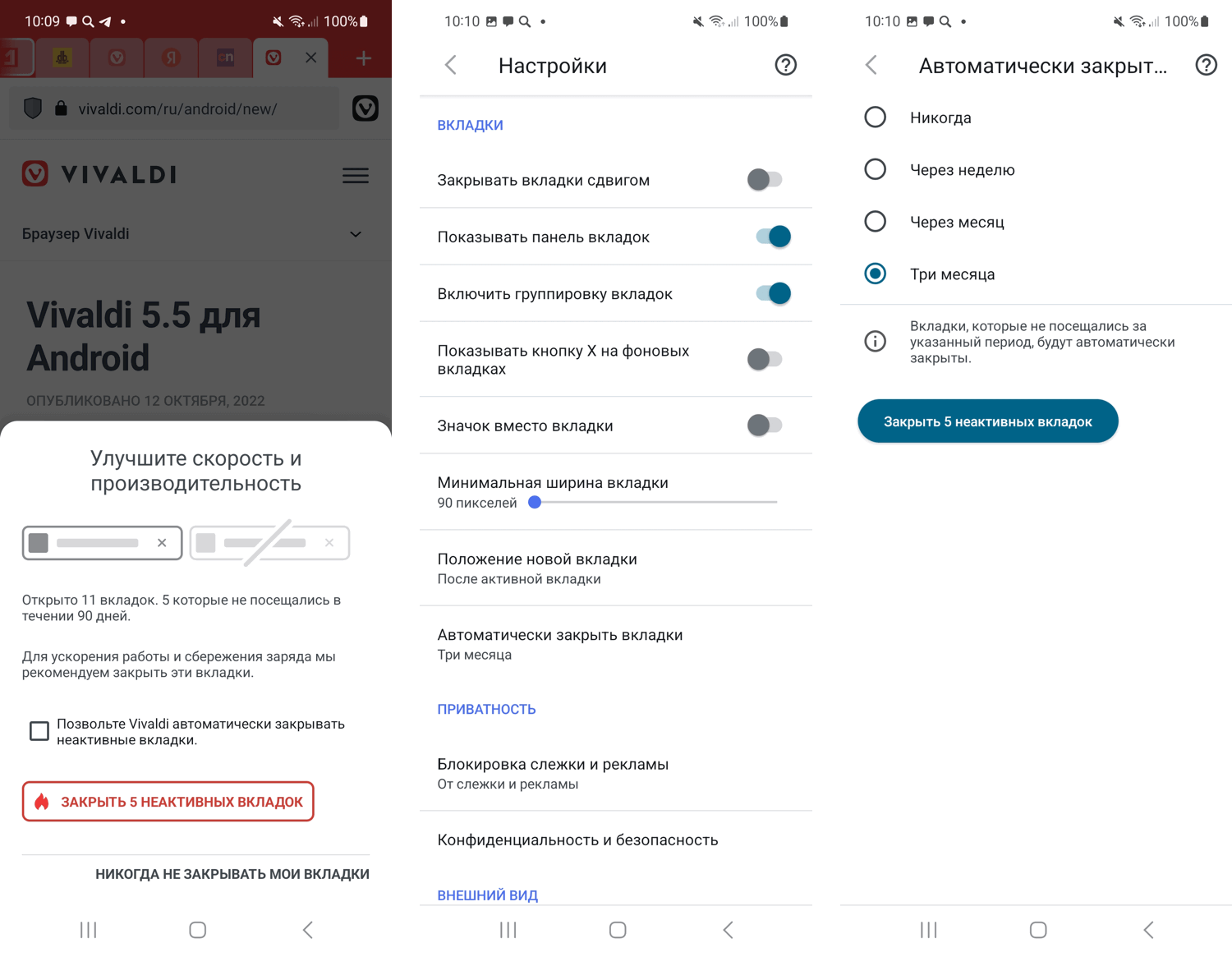 Вкладки, которые не посещались в течение указанного времени, автоматически закрываются браузером. Vivaldi 5.5 для Android может закрывать вкладки через неделю, месяц или три месяца бездействия. Закрытые вкладки могут быть повторно открыты в истории.