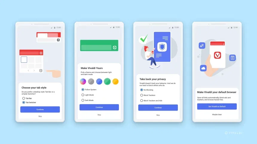 Пользователи Vivaldi 5.5. для Android получают улучшенные функции адаптации, которые помогают настроить браузер при первом запуске. По-прежнему можно выбрать опцию Быстрый старт, чтобы сразу приступить к серфингу, но пользователи, выбравшие вариант Настроить, могут изменить браузер по своему вкусу.