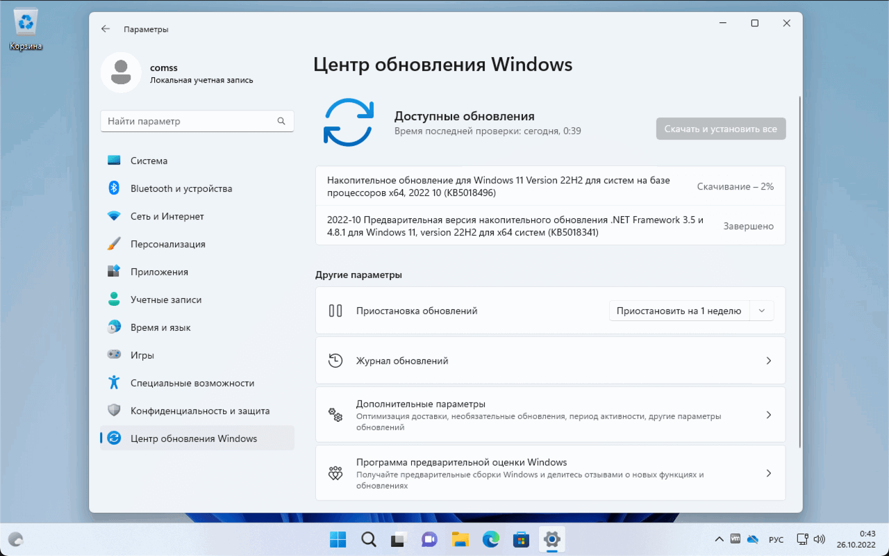 Когда вы увидите, что доступно Накопительное обновление для Windows 11 Version 22H2 для систем на базе процессоров x64, 2022 10 (KB5018496) нажмите Скачать и установить.