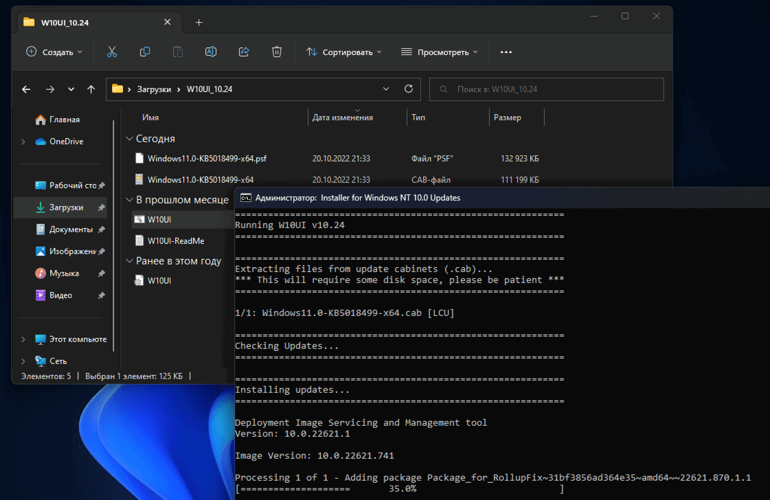 - Скачайте два файла обновления KB5018499 (.CAB и .PSF) для выбранной платформы (x64 или ARM64) и поместите в папку W10UI_10.24.