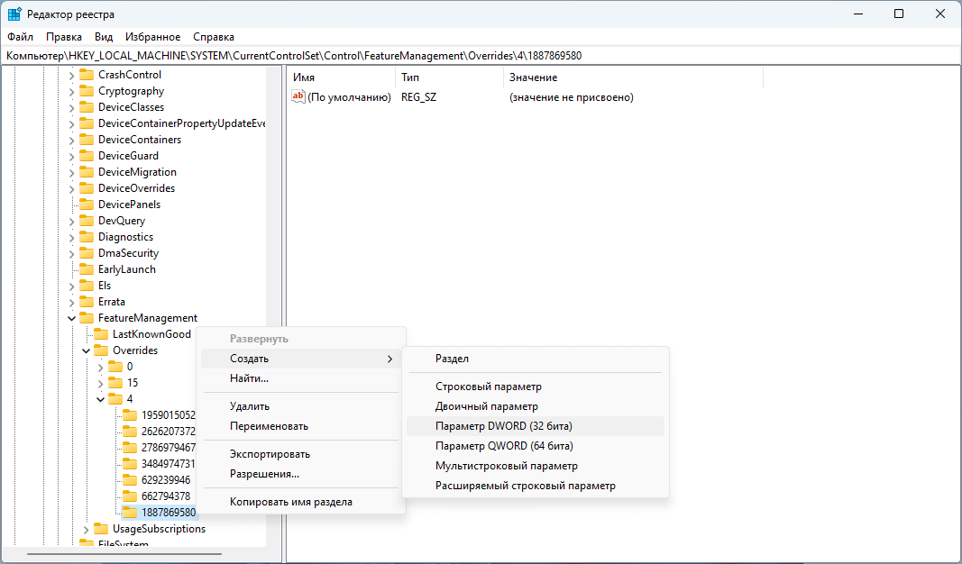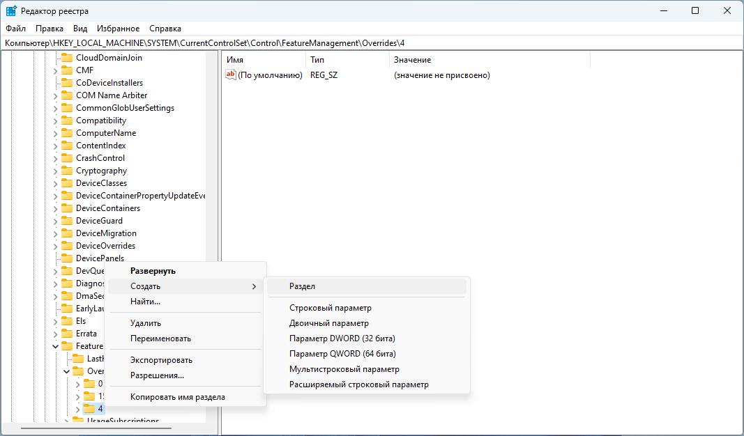 - Нужно создать новый раздел в папке с именем 4. В левой панели кликните правой кнопкой мыши по разделу 4 и выберите Создать > Раздел. Укажите следующее имя: 1887869580.
