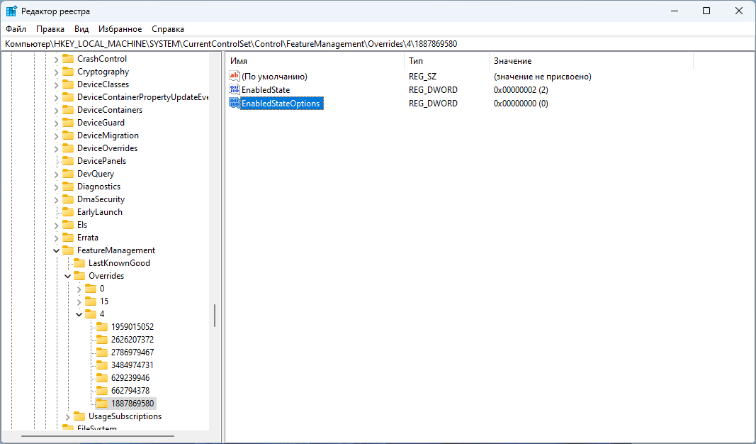 HKEY_LOCAL_MACHINE\SYSTEM\CurrentControlSet\Control\FeatureManagement\Overrides