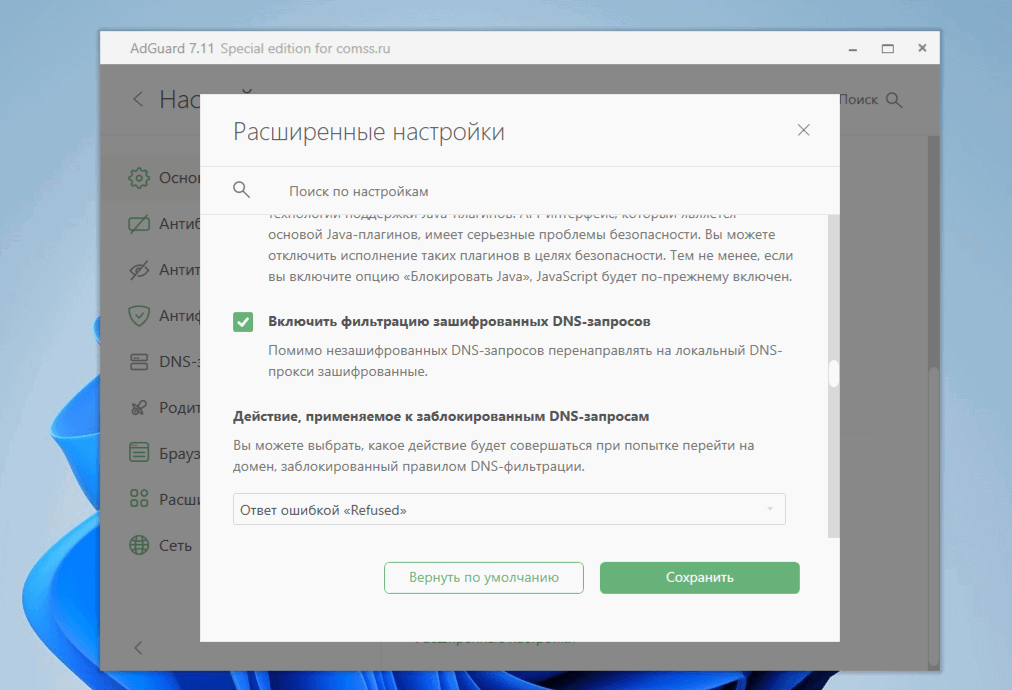 Теперь AdGuard может фильтровать зашифрованные по протоколу DNS-over-HTTPS запросы поверх простых запросов DNS. Чтобы включить эту опцию, установите флажок Включить фильтрацию зашифрованных DNS-запросов в Расширенных настройках.