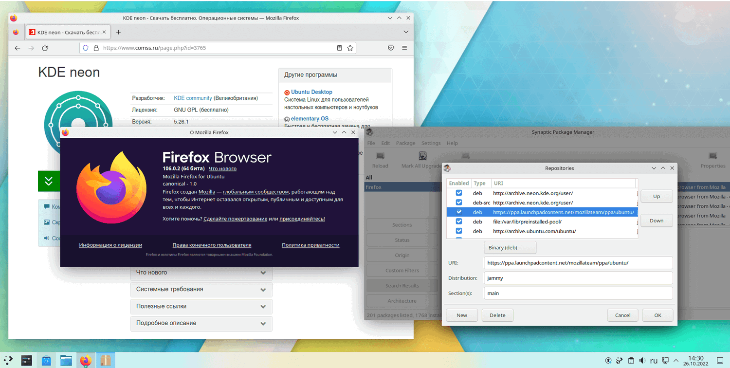 Кроме того, известно, что разработчики KDE neon откладывали переход на базу Ubuntu 22.04 из-за неясности с поставками формата пакетов веб-браузера Firefox. В Ubuntu 22.04 веб-браузер Firefox поставляется в формате Snap. Однако, разработчики дистрибутива KDE neon приняли решение поставлять браузер в формате deb, добавив PPA-репозиторий Mozilla Firefox Team.