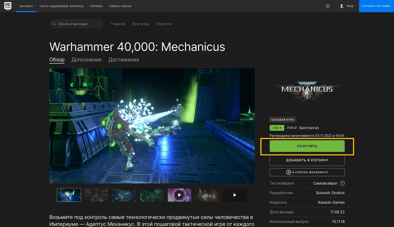 1. Перейдите на страницу Warhammer 40,000: Mechanicus. Прокрутите страницу чуть ниже и в правом нижнем углу описания игры нажмите на кнопку Получить.