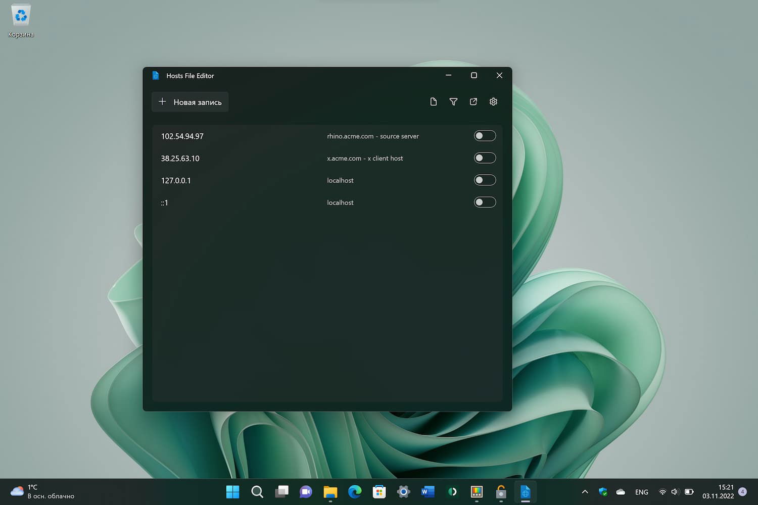 В интерфейсе редактора доступны функции фильтрации. Hosts File Editor — один из самых слабых инструментов PowerToys. Он имеет громоздкий интерфейс и в нем отсутствуют функции импорта и экспорта и режим быстрого редактирования.