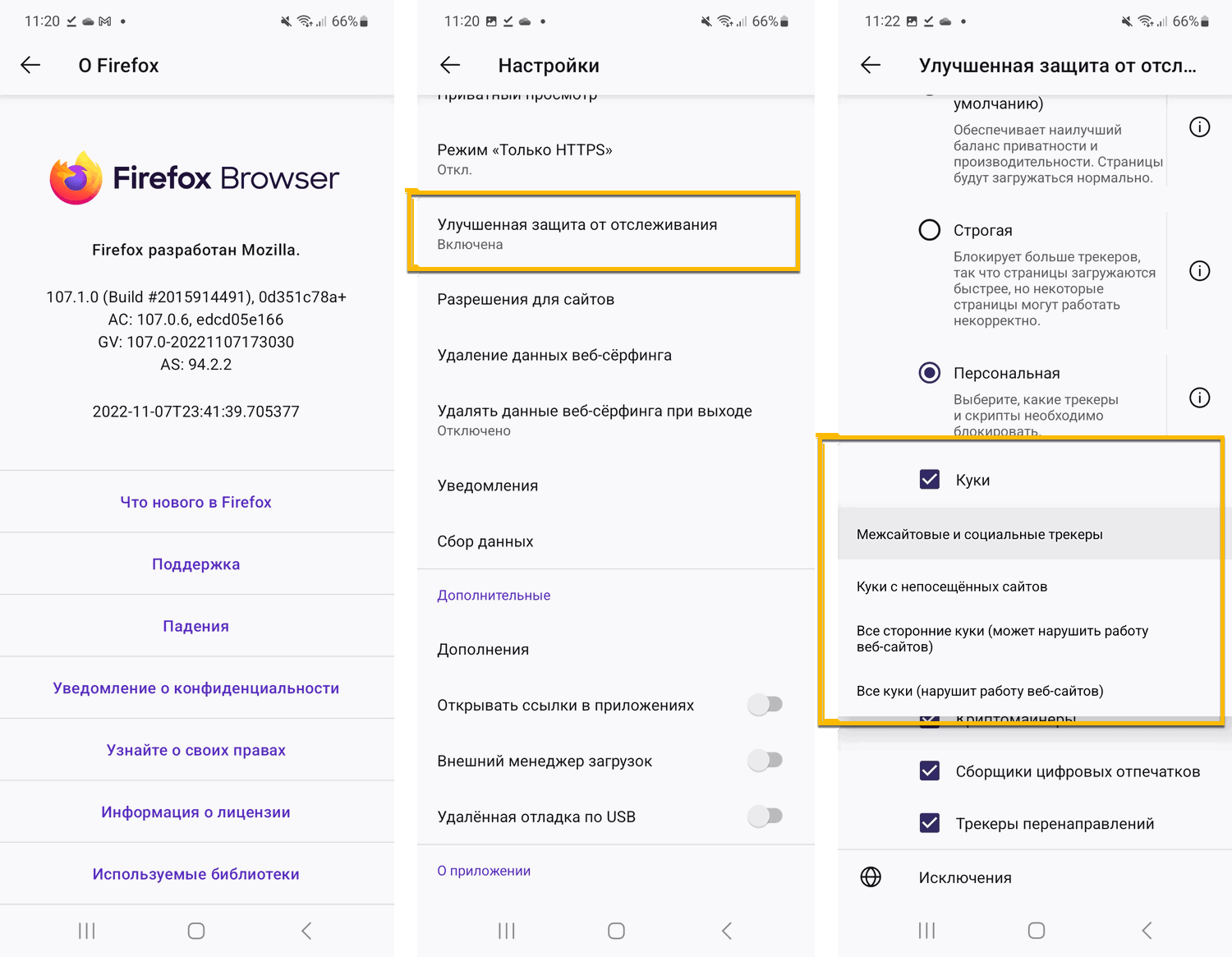 «Полная защита от кук» в Firefox 107 для Android похожа на песочницу для файлов cookie. Браузер создает отдельное пространство для хранения файлов cookie каждого веб-сайта (раздел локального хранилища). Таким образом, при включенной функции изоляции основных файлов куки, файлы куки сайта не могут быть доступны другим веб-сайтам, что предотвращает отслеживание вашей активности на разных сайтах.