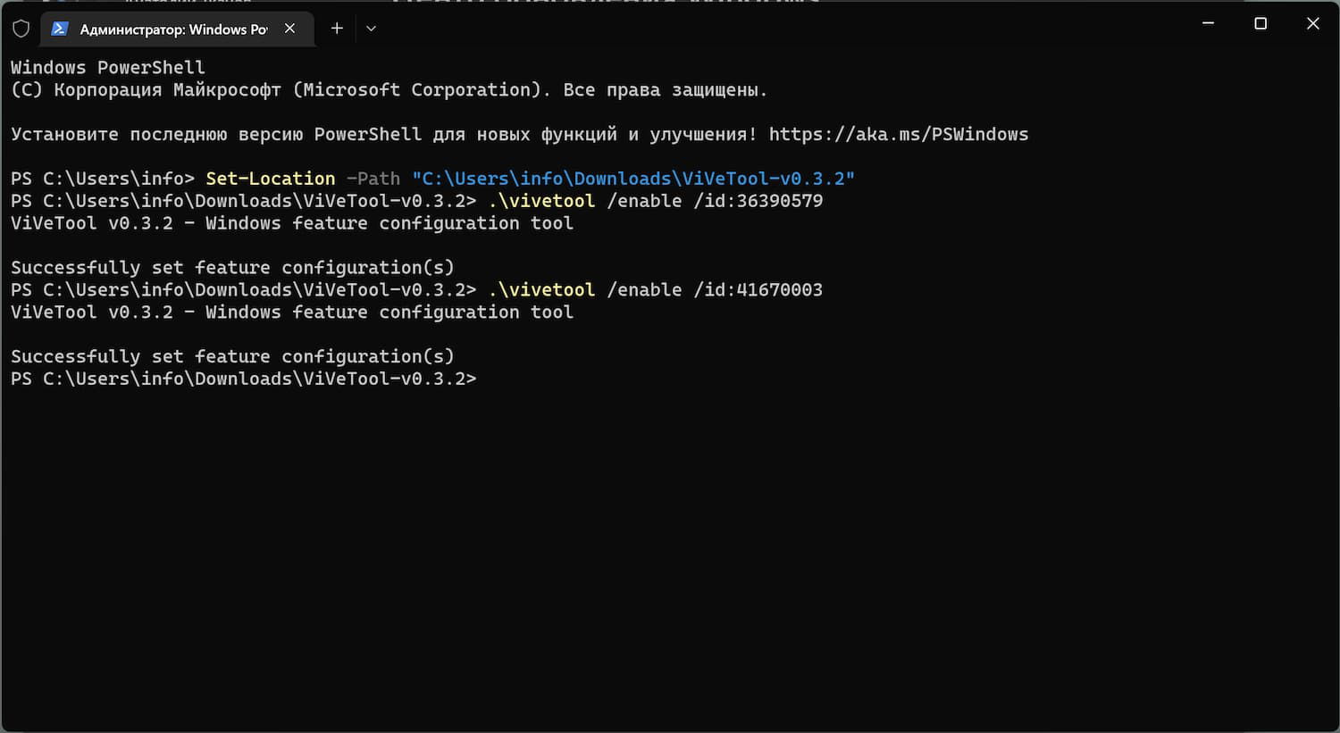 В примерах используются команды в Терминале для профиля PowerShell . Если вы используете профиль Командная строка, замените начальную команду .\vivetool на vivetool.
