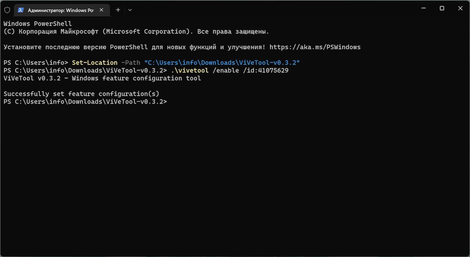 В примерах используются команды в Терминале для профиля PowerShell . Если вы используете профиль Командная строка, замените начальную команду .\vivetool на vivetool.