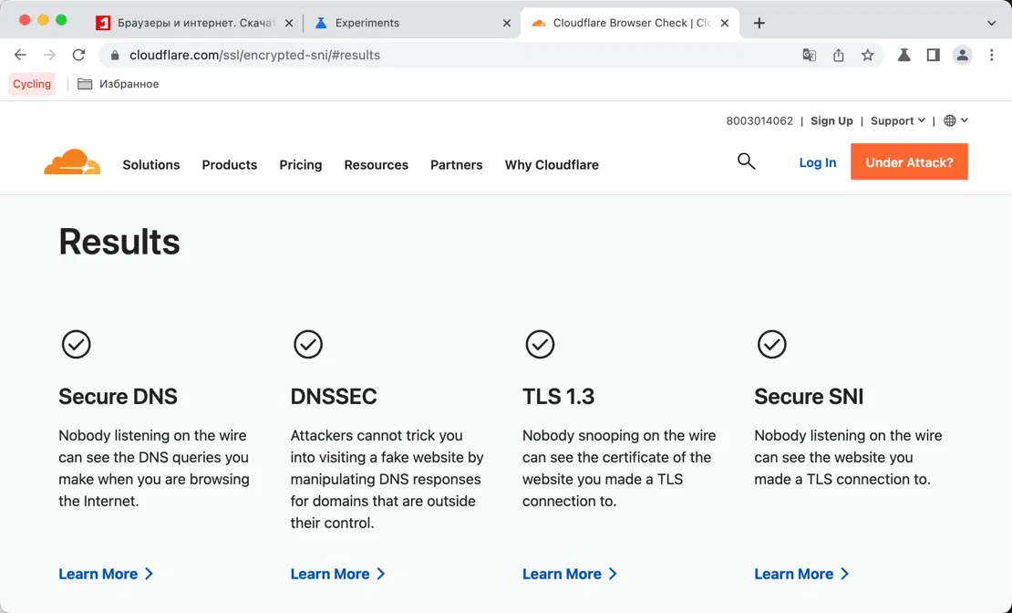 Вы можете проверить, включен ли ECH в вашем браузере на сайте Cloudflare Browsing Experience Security Check.