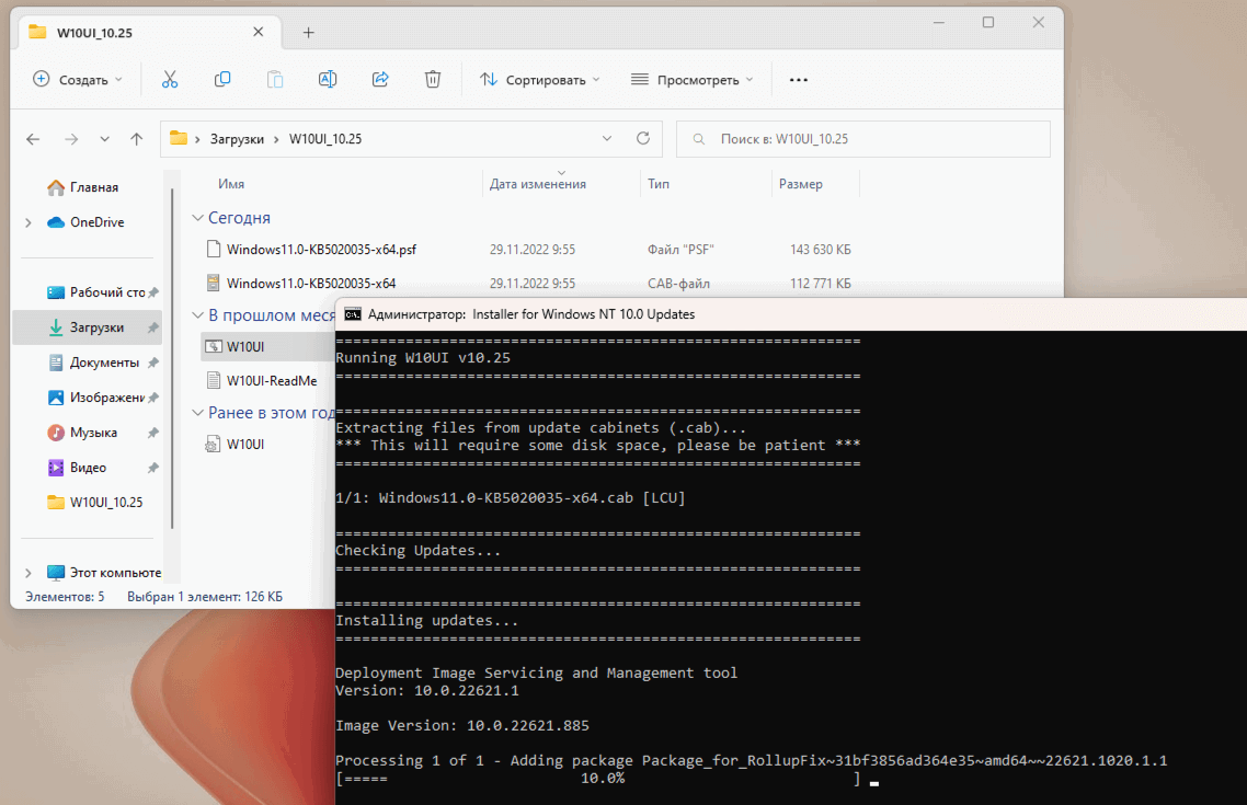 - Скачайте два файла обновления KB5020035 (.CAB и .PSF) для выбранной платформы (x64 или ARM64) и поместите в папку W10UI_10.25.