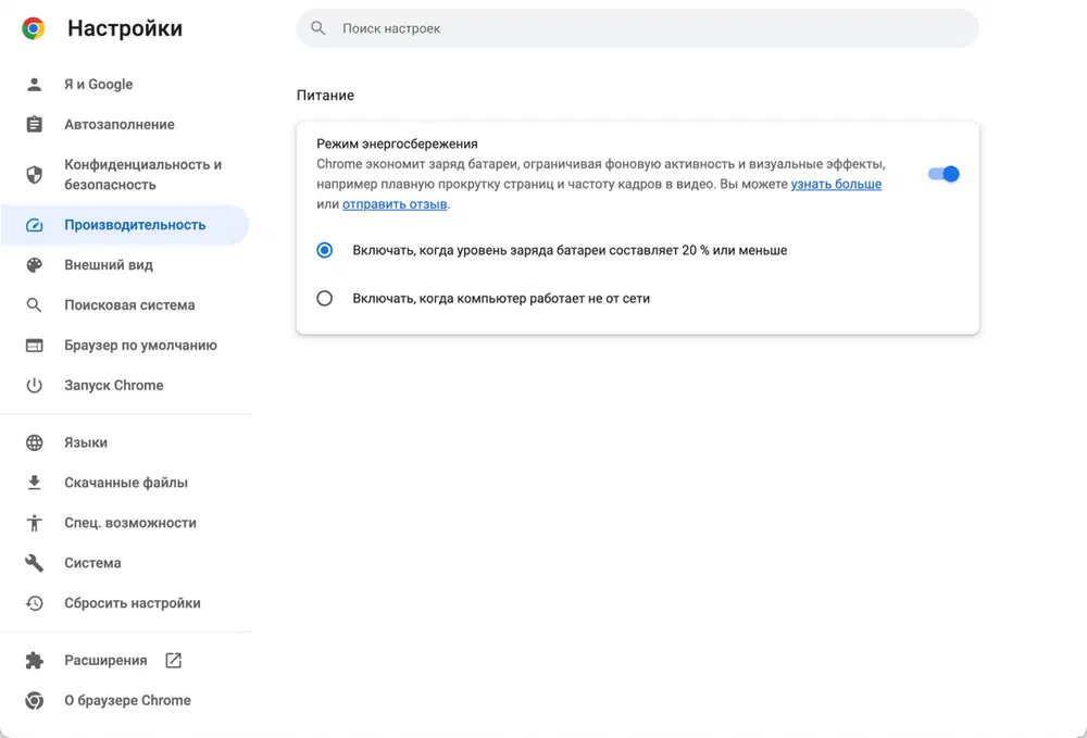 Эта функция предназначена для настольных версий Chrome и устройств Chromebook. На данный момент функция является экспериментальной и доступна для активации с помощью флага. Если этот параметр включен, вы можете включить режим энергосбережения, когда заряд батареи составляет 20 % или ниже, или когда ваш компьютер отключен от сети.