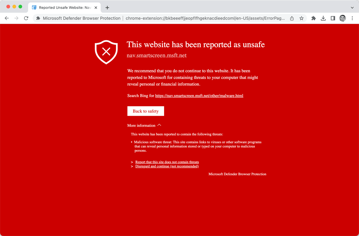 Microsoft выпустила расширение безопасности под названием Windows Defender Browser Protection в 2018 году, для предоставления дополнительного уровня защиты в Google Chrome и браузерах на базе Chromium. Компания отмечала, что "расширение Windows Defender Browser Protection помогает защититься от онлайн-угроз, таких как ссылки в фишинговых электронных письмах и веб-сайтах, которые пытаются заставить пользователя загрузить и установить вредоносное ПО, которое наносит ущерб компьютеру".