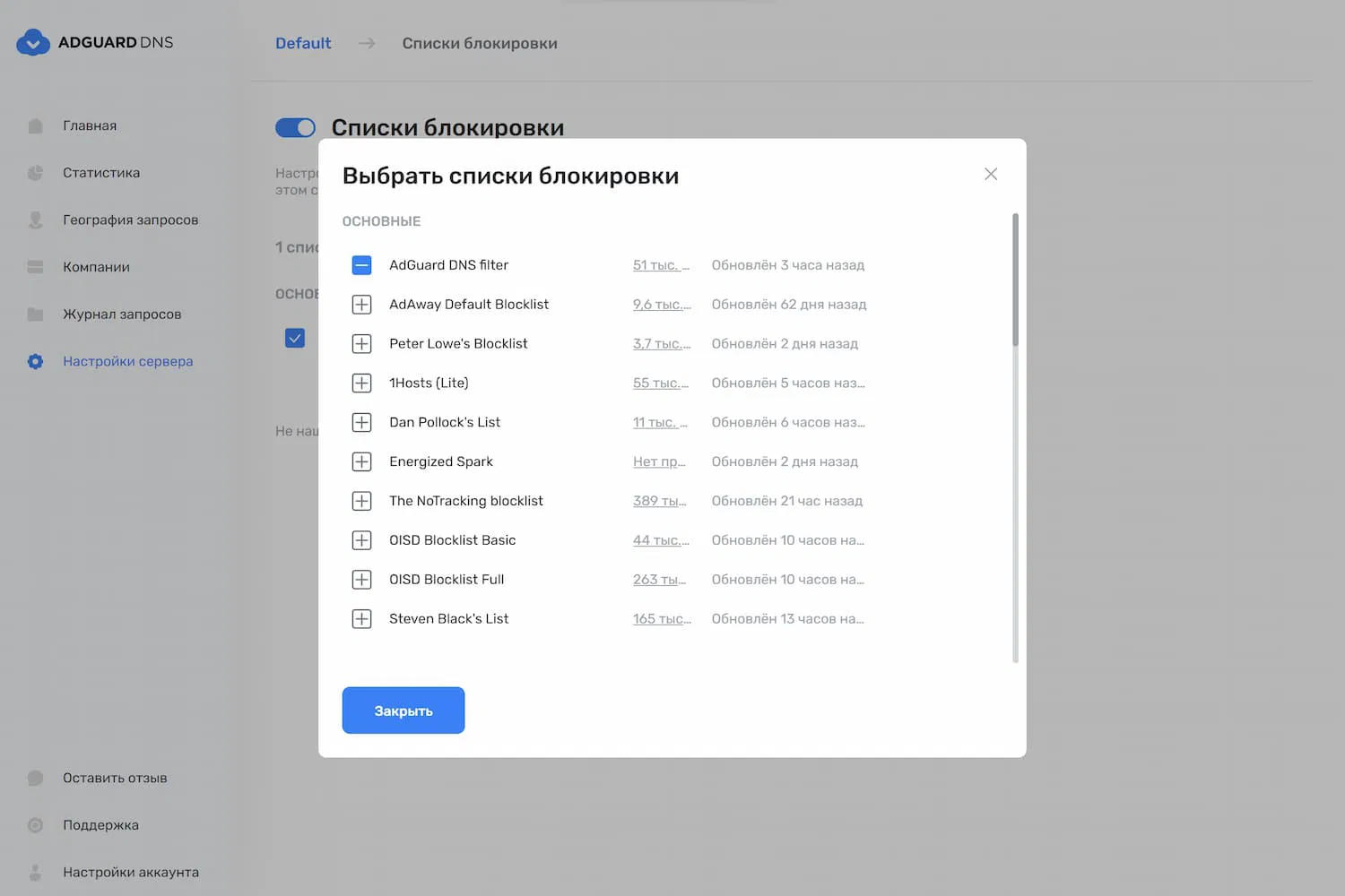 С помощью функции "Списки блокировки" вы можете установить, какие домены вы хотите блокировать, а какие нет. Вы можете выбирать из широкого спектра блоклистов для различных целей.