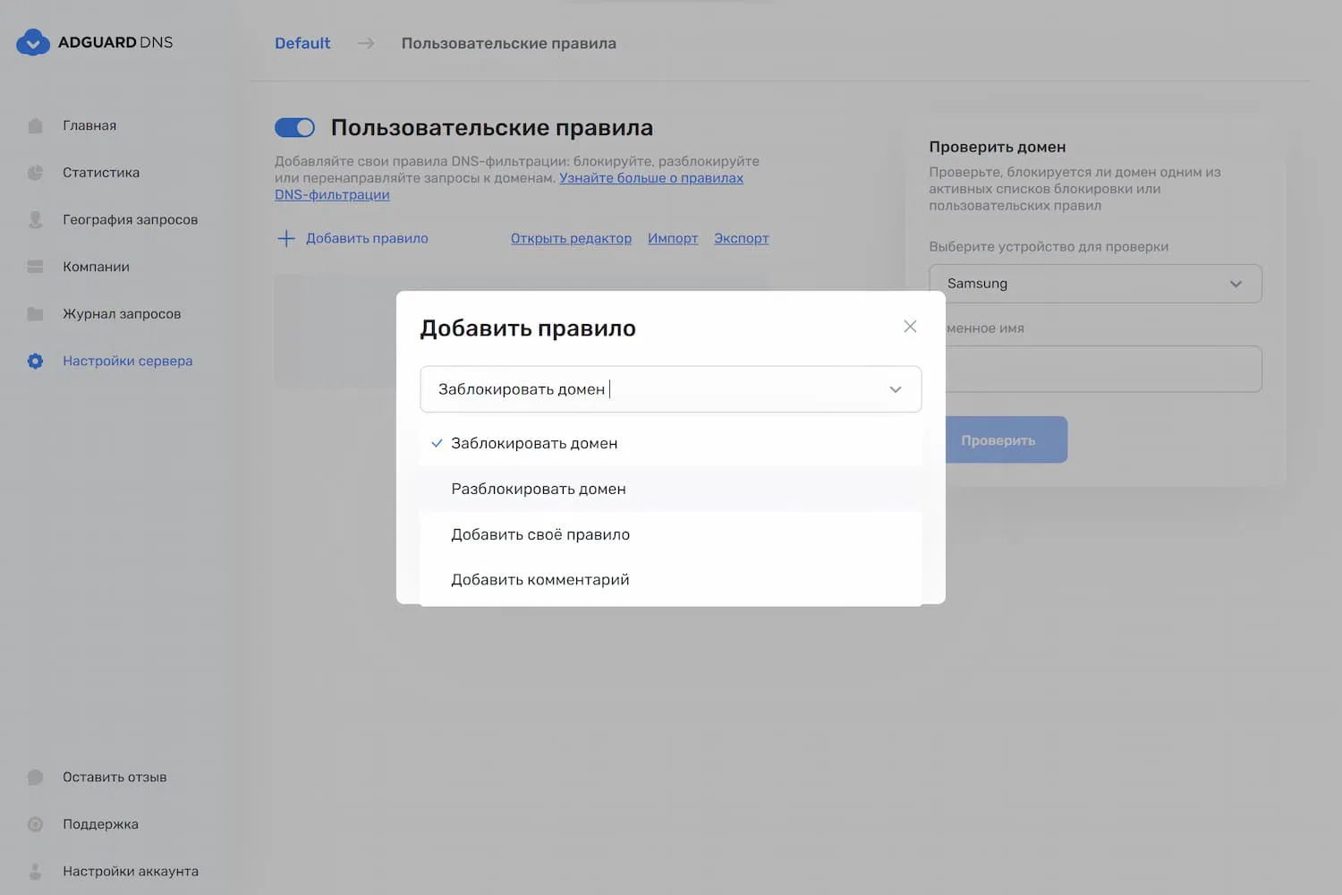 Для тех случаев, когда предустановленных списков блокировки с тысячами правил недостаточно, у нас есть удобная функция "Пользовательские правила". Здесь вы можете вручную добавить пользовательские правила для блокировки/разблокировки определенного домена или импортировать списки пользовательских правил (ознакомьтесь с синтаксисом правил фильтрации DNS). Списки можно экспортировать.