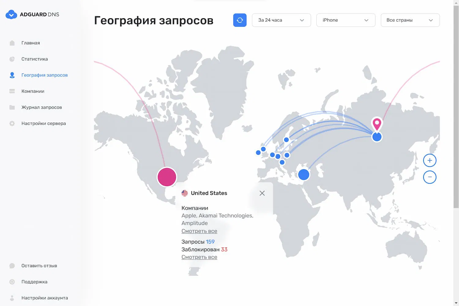 Эта функция показывает, куда направляются DNS-запросы, отправленные вашими устройствами. Помимо просмотра карты направлений запросов, вы можете фильтровать информацию по дате, устройству и стране.