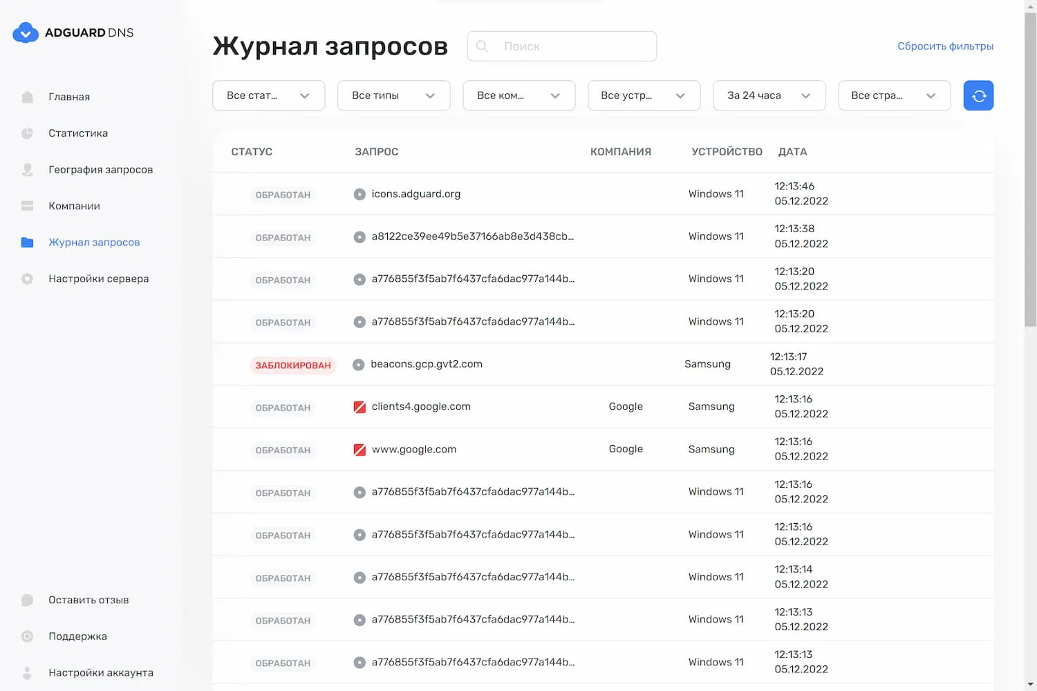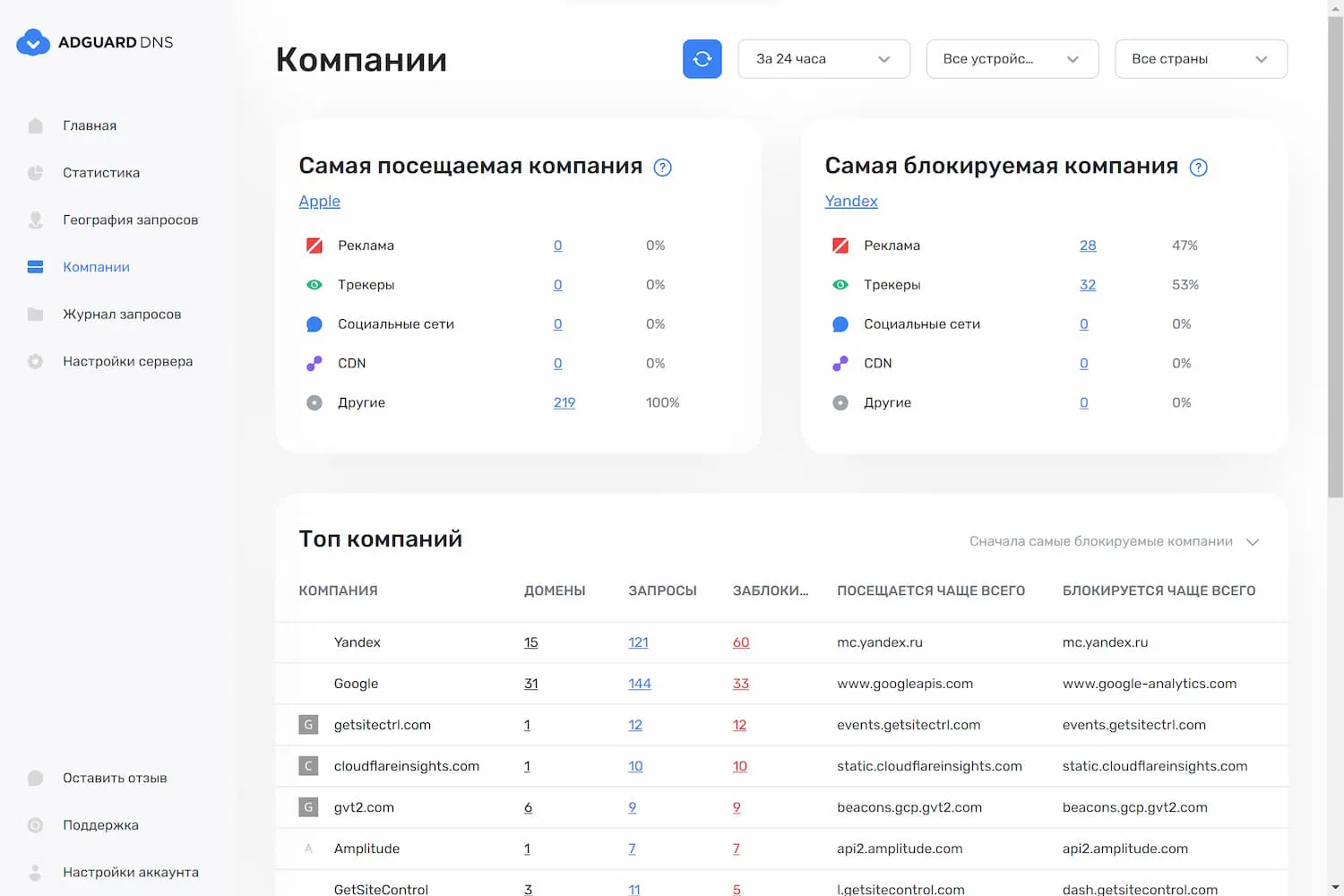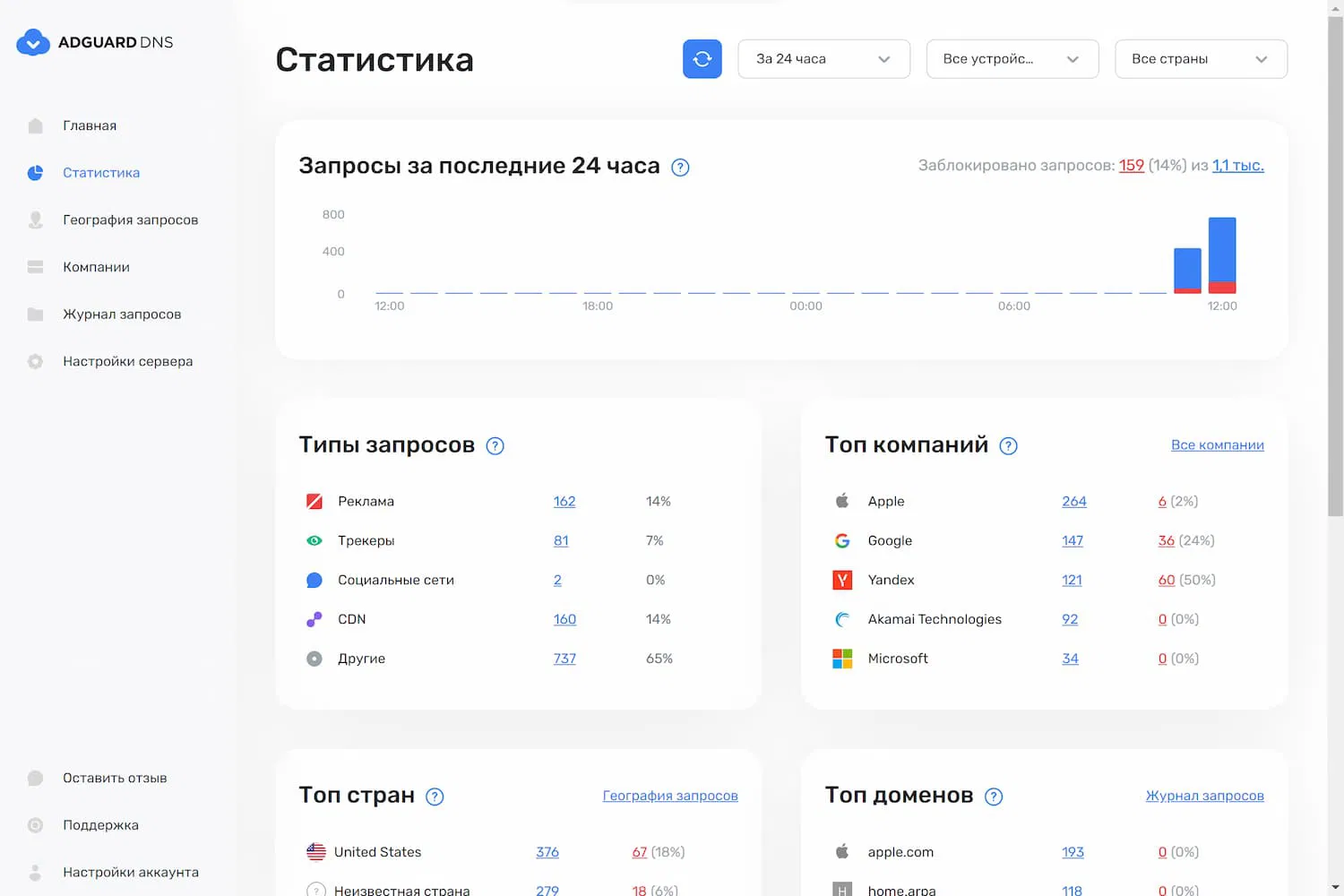 На вкладке "Статистика" вы можете увидеть всю обобщенную статистику DNS-запросов, сделанных устройствами, подключенными к вашему Приватному AdGuard DNS. Здесь показано общее количество и география запросов, количество заблокированных запросов, список компаний, которым были адресованы запросы, типы запросов и наиболее часто запрашиваемые домены.