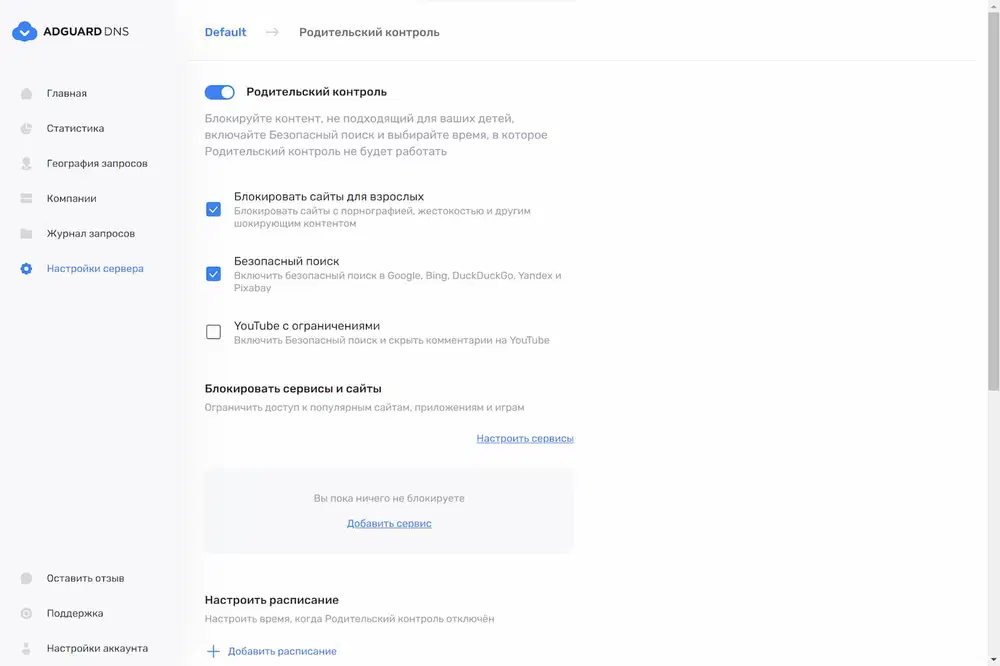 Чтобы защитить своего ребенка от нежелательного интернет-контента, который вы считаете неприемлемым, настройте и активируйте опцию родительского контроля. В дополнение к таким опциям, как блокировка "взрослого контента" и безопасный поиск, добавлена возможность вручную указывать домены для блокировки и устанавливать расписание для работы родительского контроля.