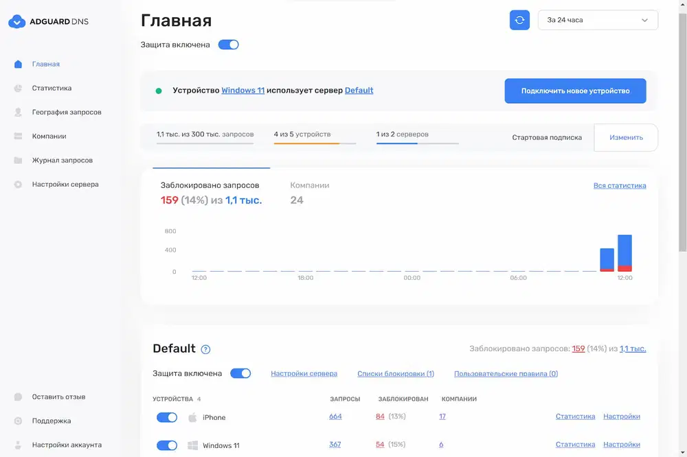 Если вы еще не пробовали Приватный AdGuard DNS, вы можете зарегистрироваться официальном сайте. Бесплатная стартовая подписка включает 300 тыс. запросов, 5 устройств и 2 личных сервера.