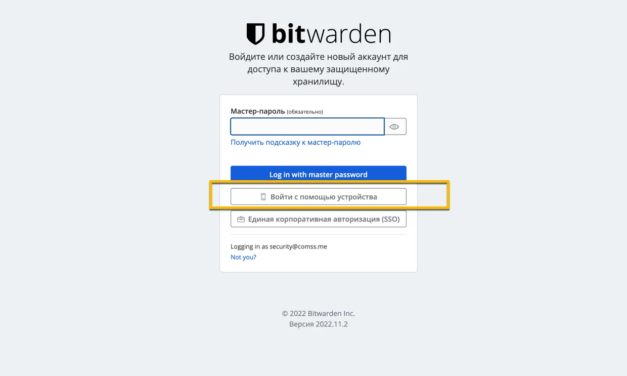 - Вместо входа с мастер-паролем выберите параметр Войти с помощью устройства.