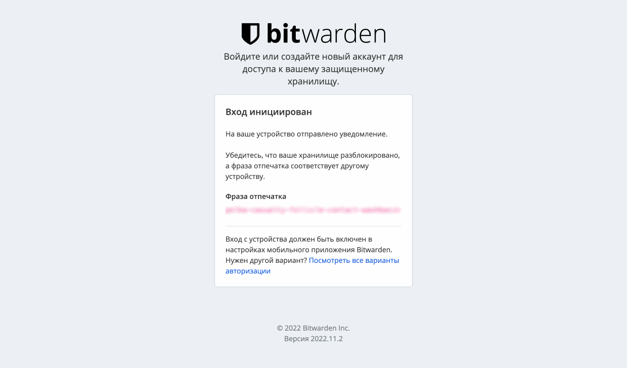 Когда вы попытаетесь использовать новый метод аутентификации, мобильное приложение и веб-хранилище отобразят предложение со случайными словами, которое является фразой-отпечатком вашей учетной записи. Эта фраза должна совпадать с фразой на другом вашем устройстве — таким образом, вы должны увидеть одну и ту же фразу в веб-хранилище и на странице запроса входа в мобильное приложение.