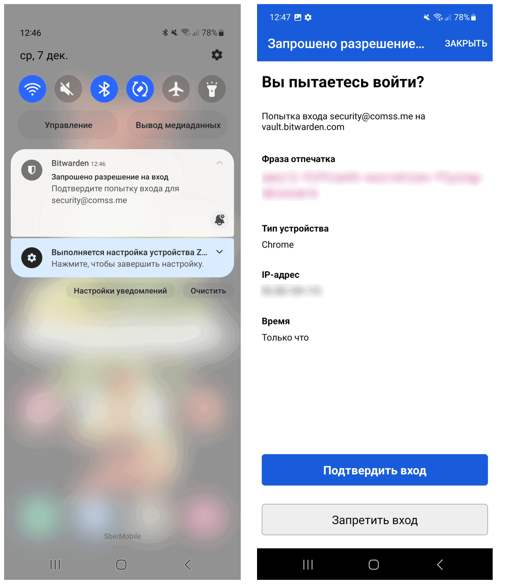 Это поможет вам убедиться, что попытка входа в систему безопасна. Мобильное приложение также предоставляет вам некоторую дополнительную информацию, такую как тип используемого устройства (используемый браузер), IP-адрес, с которого вы пытались войти в систему, и время, когда был сделан запрос. Данный метод входа без пароля в настоящее время не поддерживает официальные расширения браузера — он работает только с облачным сервером Bitwarden.