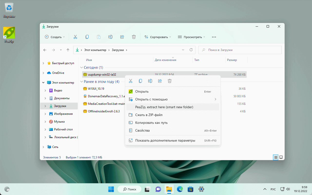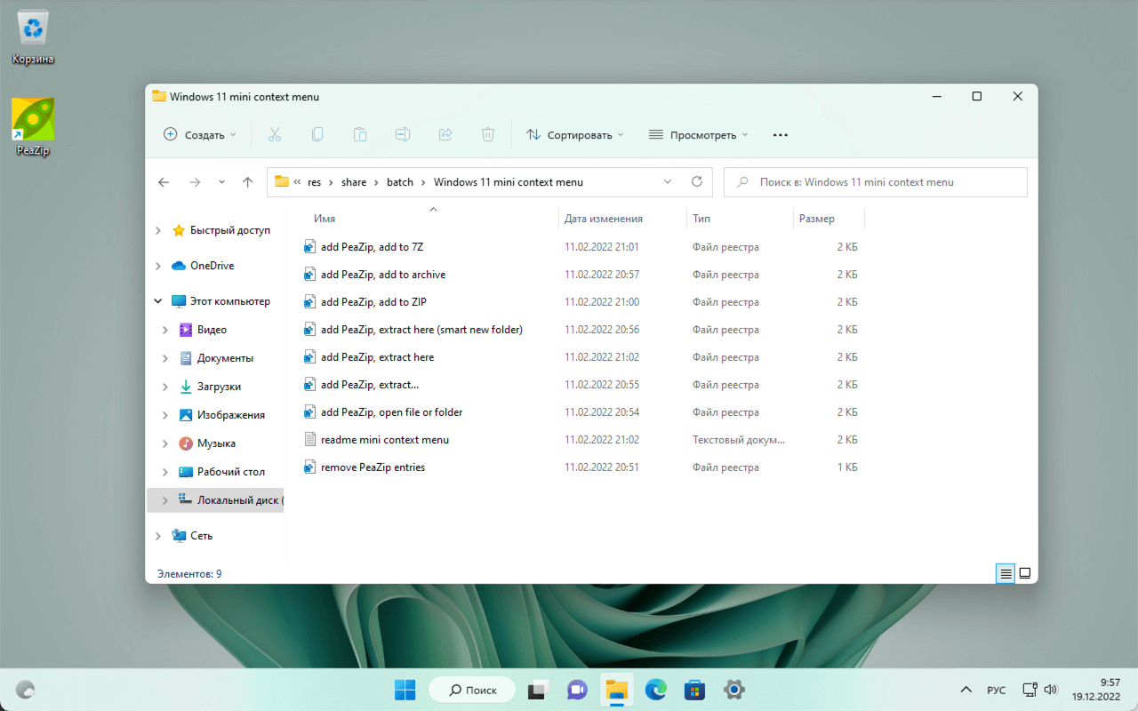 По умолчанию PeaZip 9 не поддерживает современное контекстное меню Windows 11, но пользователи могут найти файлы реестра для добавление пунктов в новое меню по пути C:\Program Files\PeaZip\res\share\batch\Windows 11 mini context menu. Пользователи могут добавить следующие пункты в меню: Открыть, Извлечь и Добавить. Предусмотрена также опция удаления.