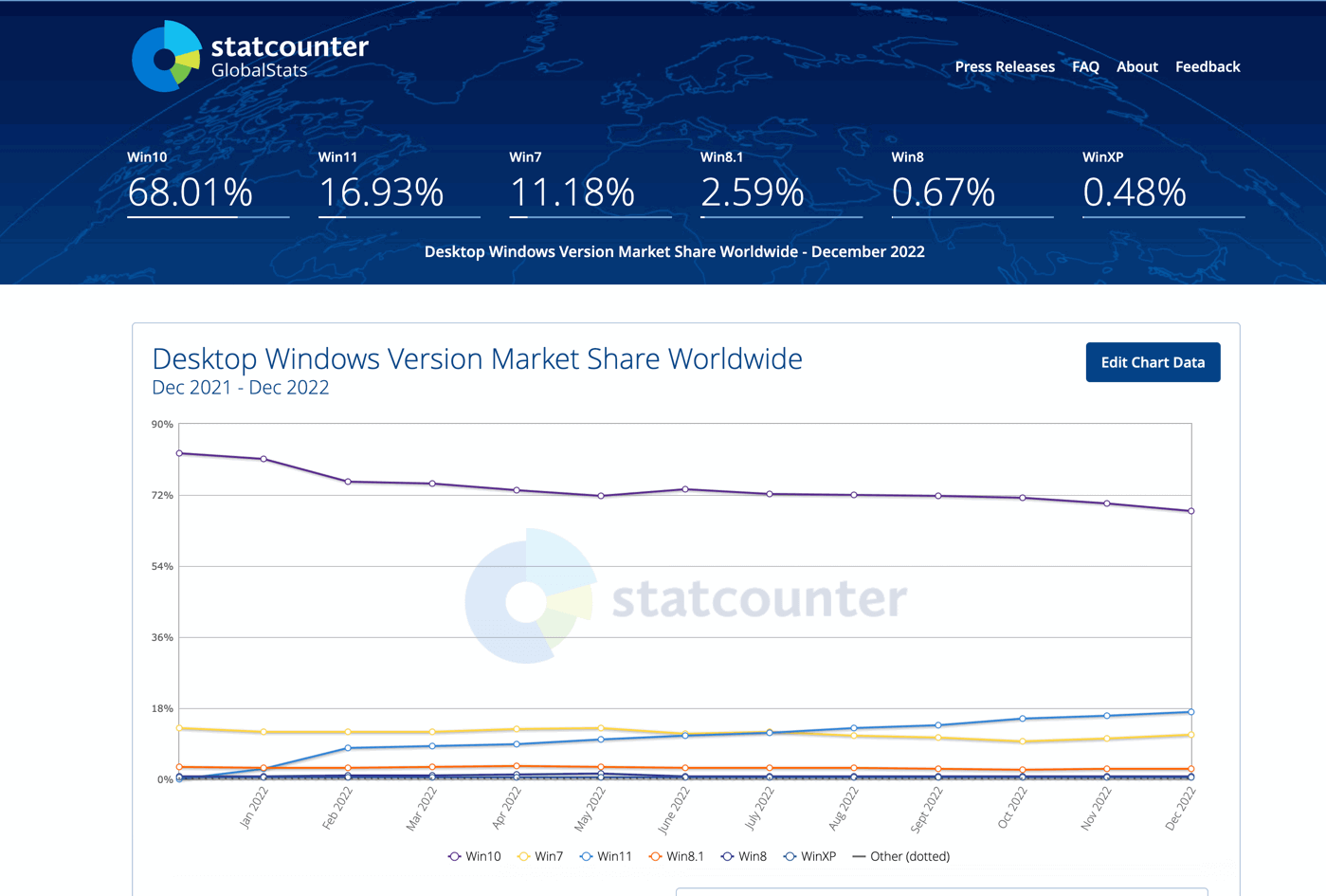 Что касается прогнозов на 2023 год, то Windows 11 должна продолжить свой медленный рост в течение года. Новая система незначительно выиграет от прекращения поддержки Windows 7 и Windows 8.1 в январе 2023 года, так как большинство старых ПК не поддерживают Windows 11. Поэтому этого будет недостаточно, чтобы значительно сократить разрыв с Windows 10.