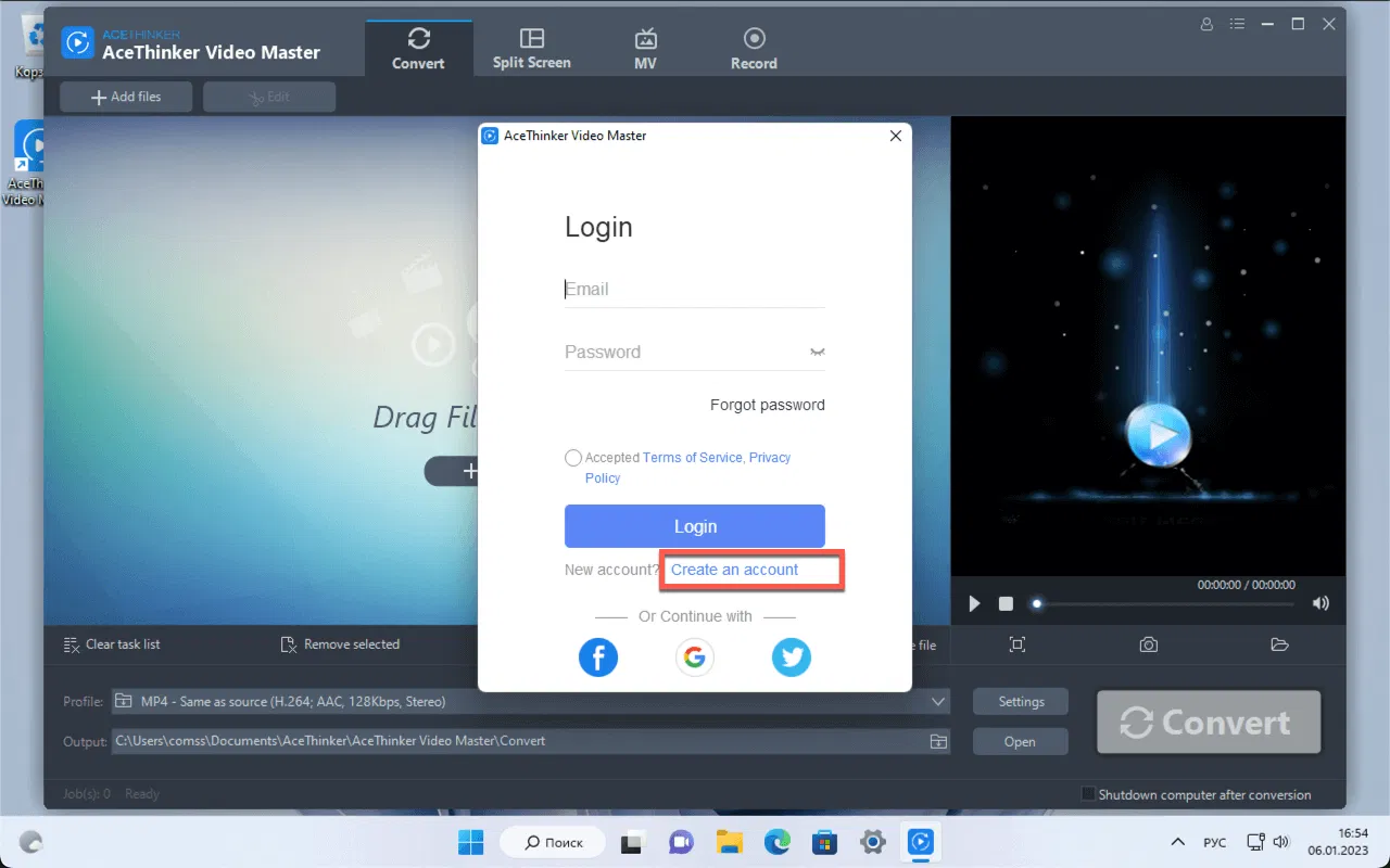 3. Войдите в существующий аккаунт AceThinker или создайте новый, выбрав Create an account. Укажите адрес электронной почты и пароль, приняв политику сервиса и лицензионно соглашение.